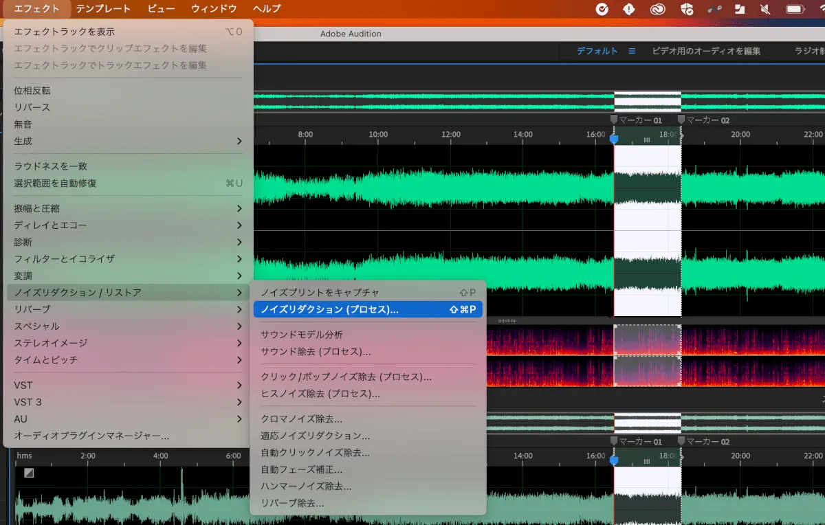 トンネル内の走行音をキャプチャできたら、あとはマーカーをつけたトンネル内の領域を選択し、ノイズリダクション(プロセス)をどんどん適用していきます。