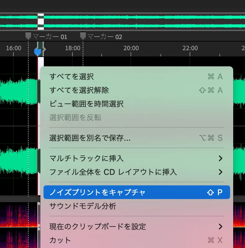 マーカーをつけてトンネル内の領域を把握することができたら、次はトンネル内の走行音をノイズリダクションで削除していきます。まずはトンネル内で走行音だけが流れている場所を選択し、ノイズプリントをキャプチャします。画像のように選択した箇所を右クリックして選ぶこともできます。(こちらもShift+Pのショートカットキーがありますので積極的に使っていきましょう。)