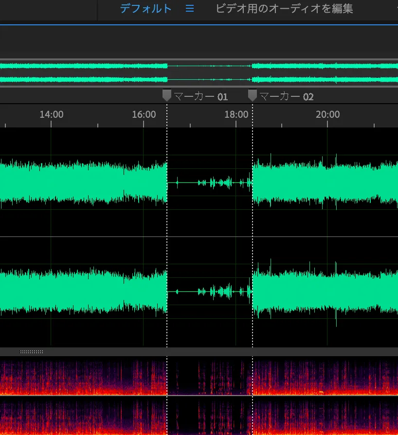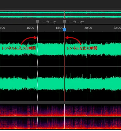 音声を取り込むことができたら、音だけでなく動画を確認しながら、トンネルに入った瞬間と抜けた瞬間にマークを1つずつ付けていきます。
