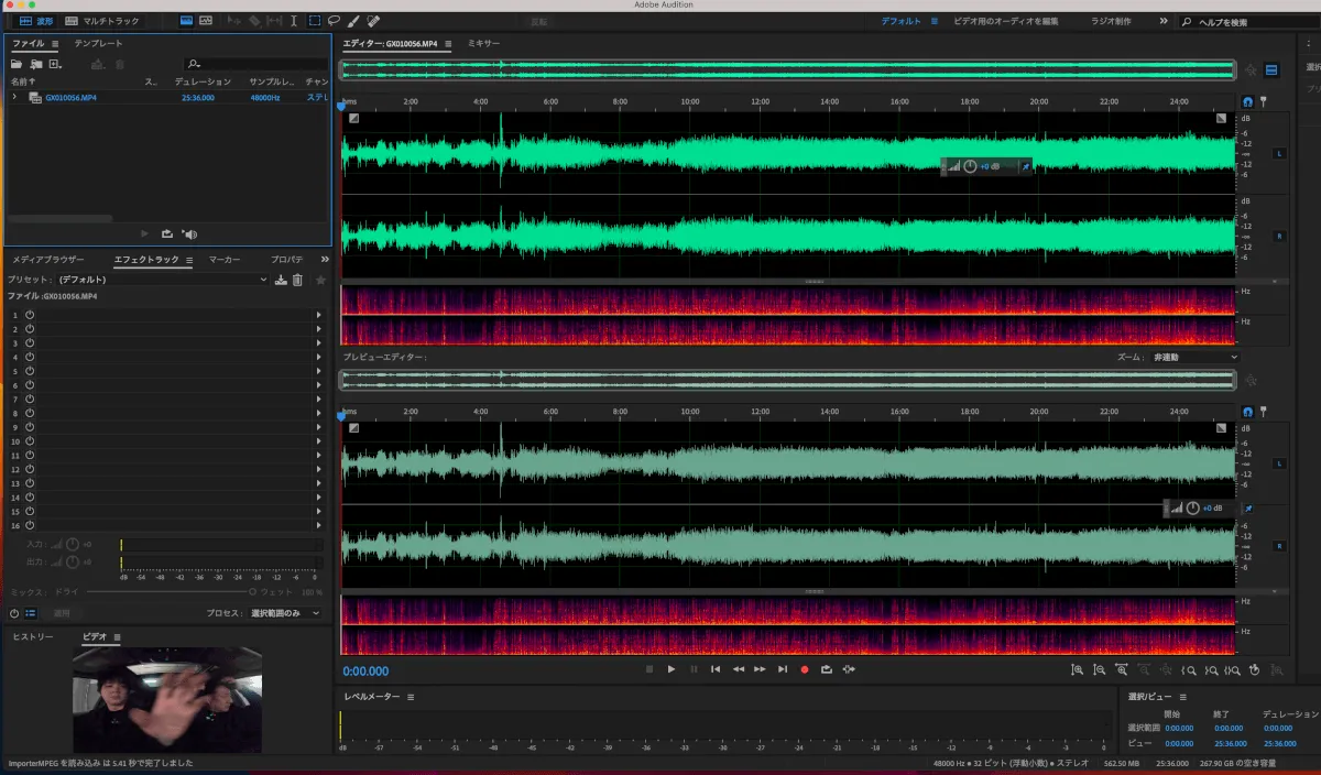 ポイントは、トンネル内の走行音のノイズプリントのキャプチャリングとトンネル外のキャプチャリングを分けることです。1箇所だけキャプチャリングして全範囲に適用した方が圧倒的に楽なのにと感じる気持ちは同じ編集者として非常によく分かりますが、やはり場所やシーンごとにきちんとノイズプリントをキャプチャリングする価値は完成した動画を見直してみても大きいと感じます。
