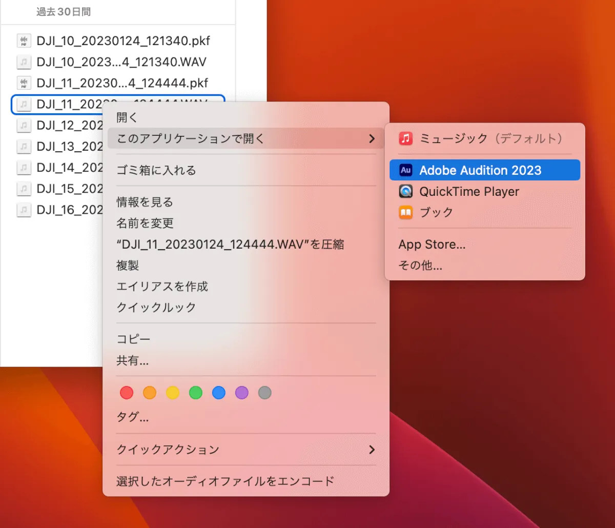 編集したい音声データを右クリック>このアプリケーションで開く>Adobe Audition 2023を選んでAuditionで開きます。