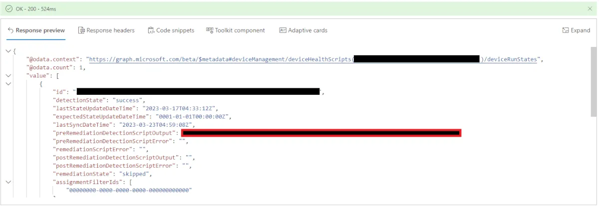 ⑤ [Run query] をクリックし、[Response preview] から “preRemediationDetectionScriptOutput” プロパティにインベントリ情報が格納されていることを確認します。