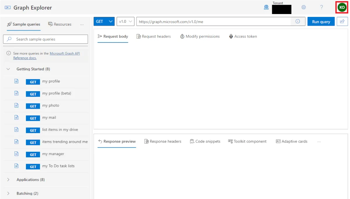 ② Graph Exploler にアクセスし、画面右上のアイコンから管理アカウントでログインします