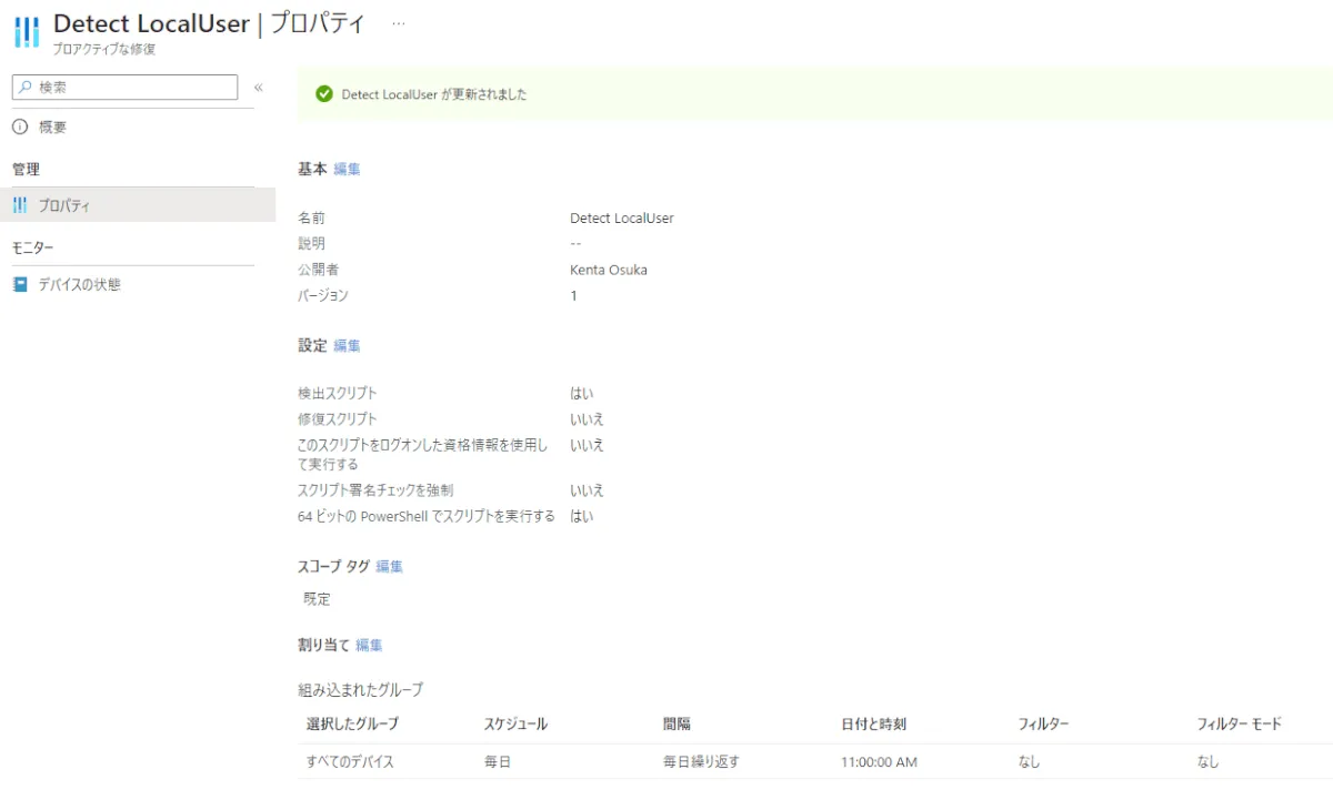 ③ パッケージが無事実行されると、「修復前の検出の出力] に Local Admin ユーザーの一覧が json 形式で出力されていることが確認できます。