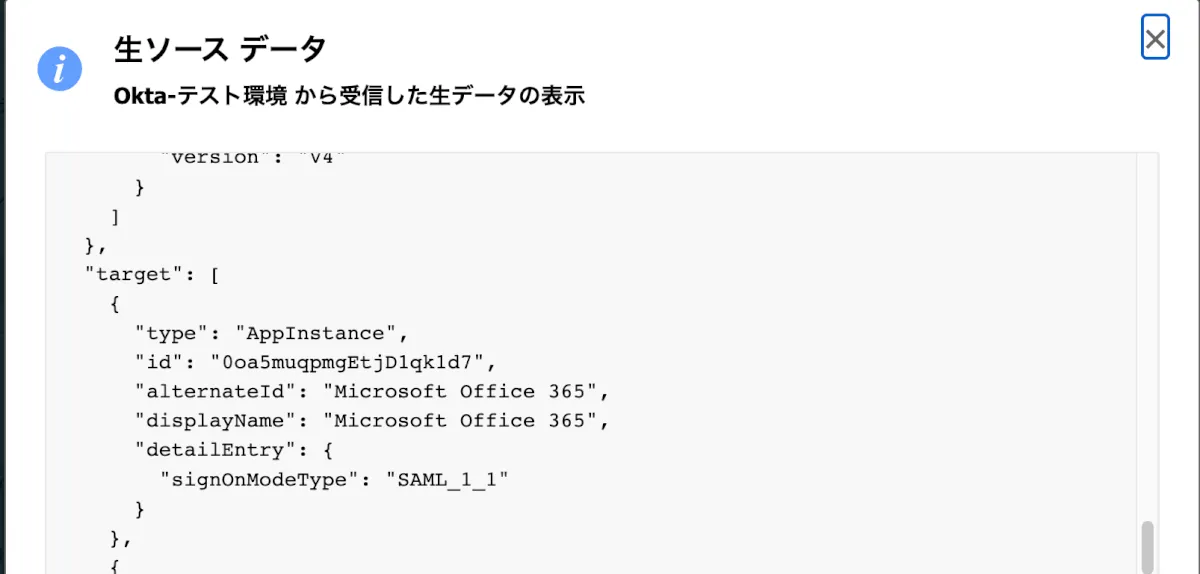 Okta側のログで表示されているTargetsがMDA側ではパット見では確認することができませんが、生データのJSONを確認すると以下のように確認することができます。