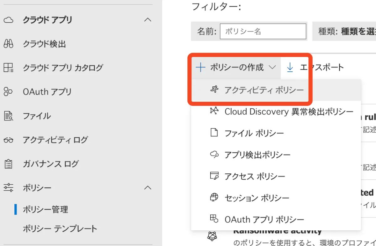 - 「ポリシー作成」→【アクティビティポリシー】をクリックします。