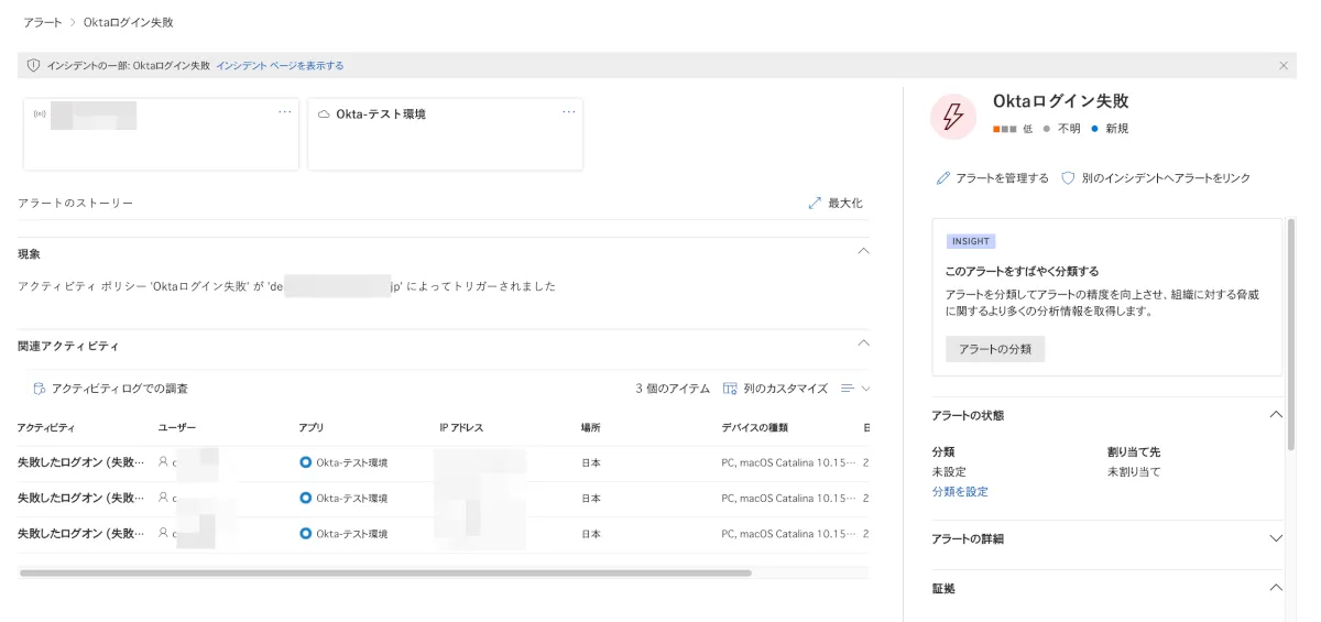 アラート名をクリックすると、詳細が表示されログインしようとしたユーザー名や、どのIPアドレスからか等の表示とともに、3回以上ログインに失敗していることがわかります。