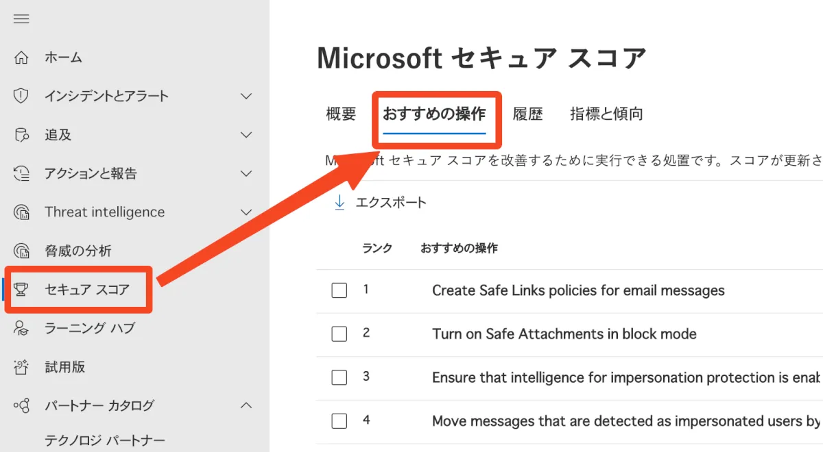 - MDA管理コンソールから、「セキュアスコア」→「おすすめの操作」タブを選択します。