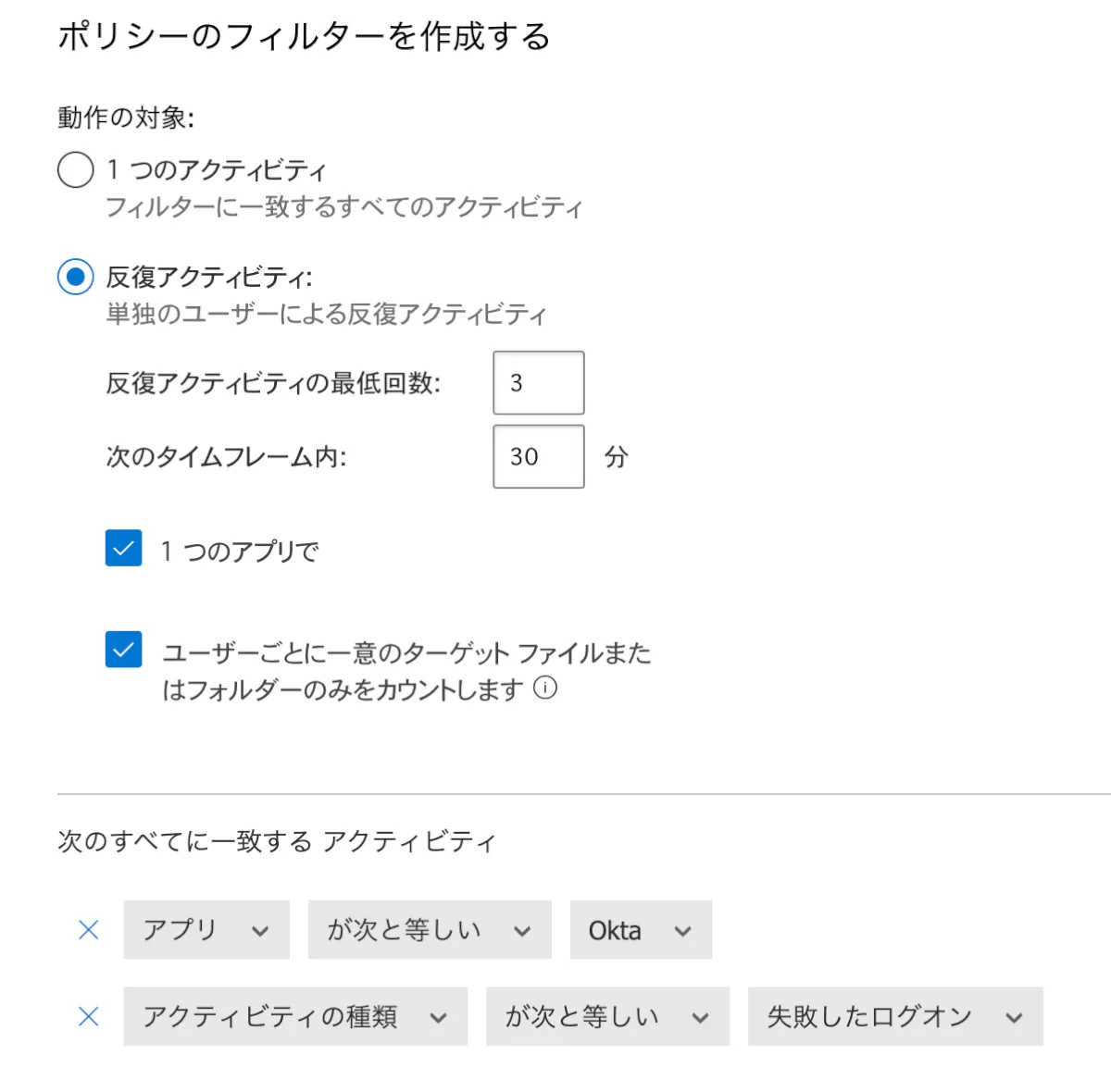 また、MDAに接続したあとはMDA側でポリシーを作成することによって、Okta側でのログ検知してMDAからアラートを上げることができるようになります。