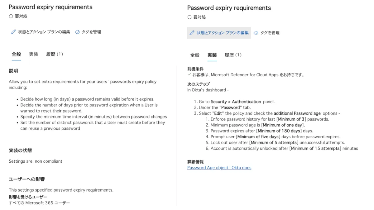 - おすすめの操作一覧が表示されるので、状態が「要対処」となっている項目を確認し、Okta側の設定を変更していきましょう。