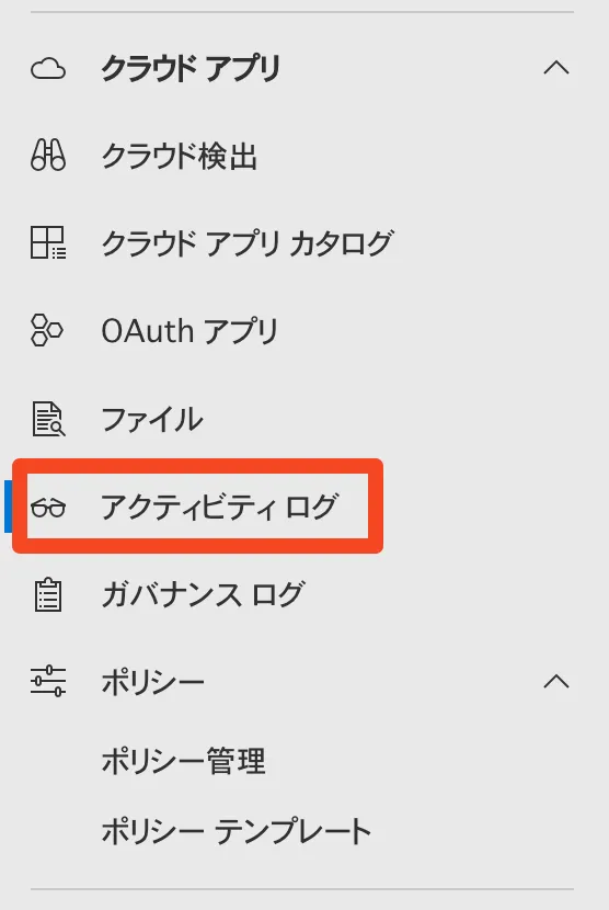 - 「クラウドアプリ」→【アクティビティログ】をクリックします。
