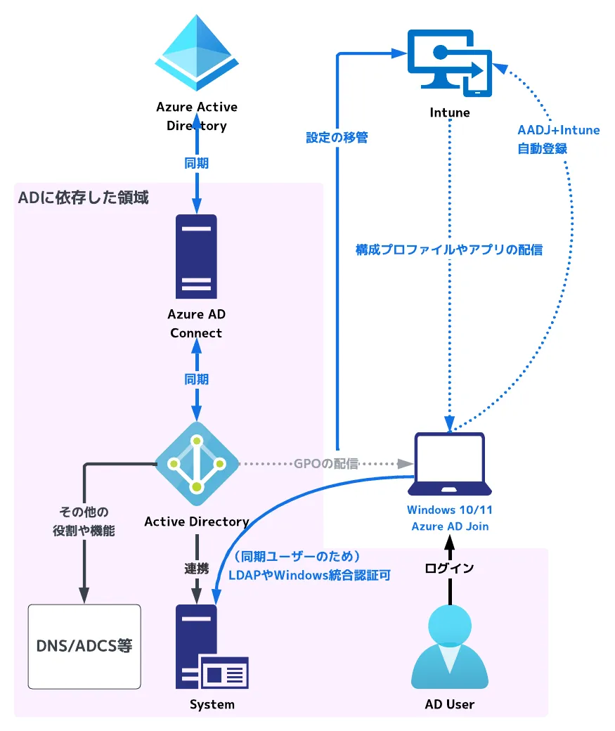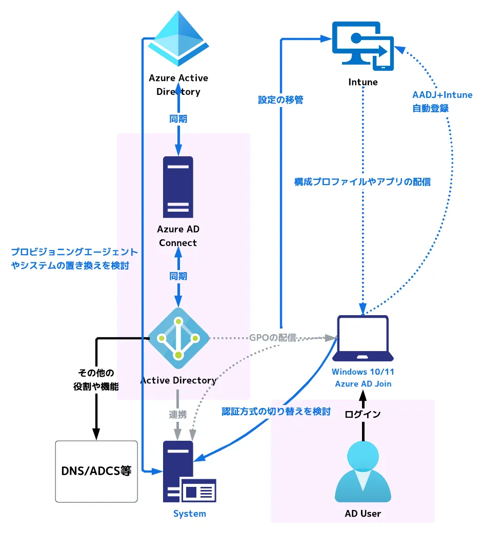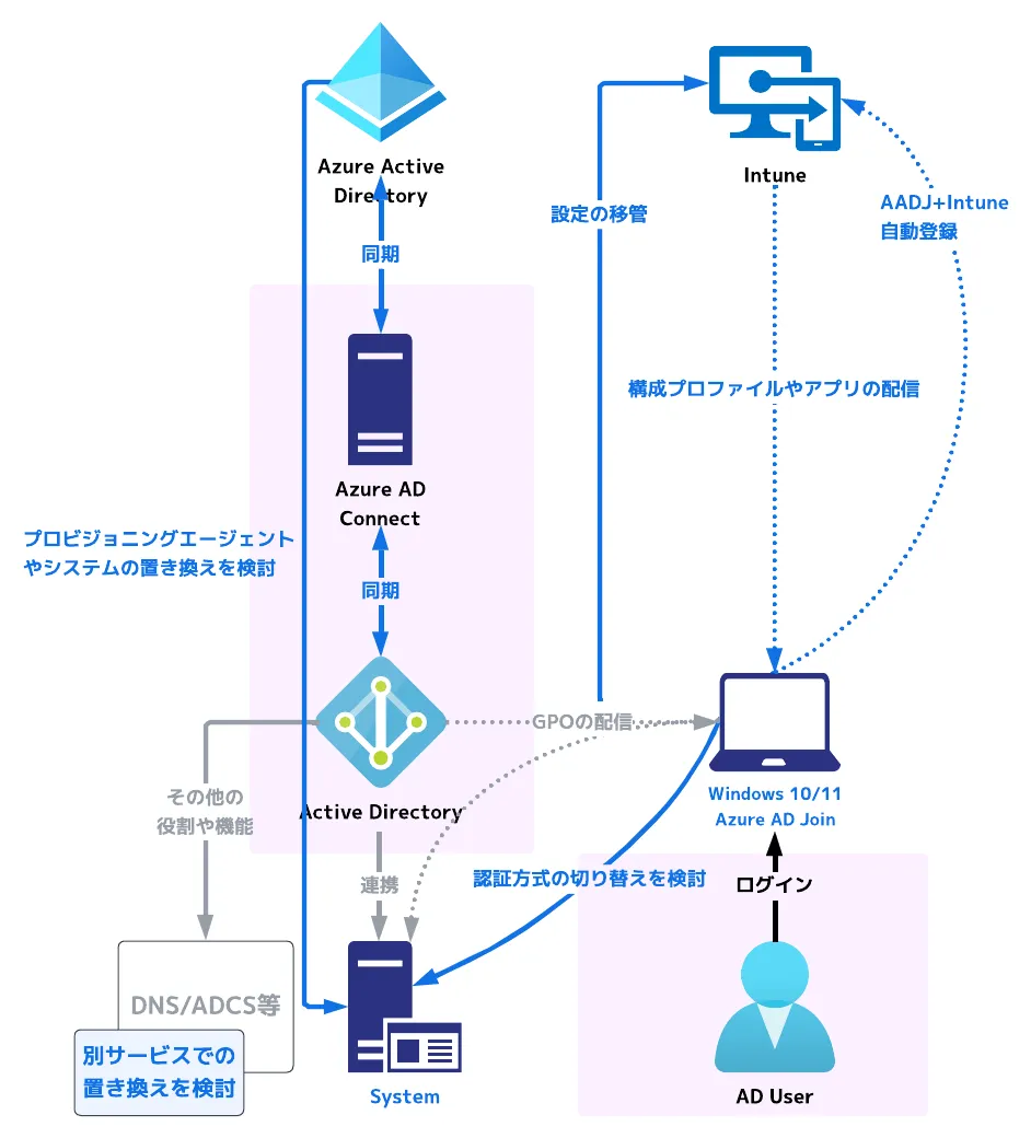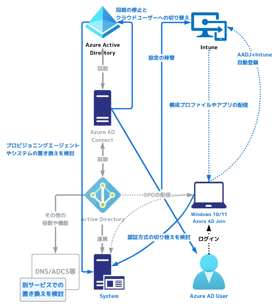このように周辺機能も含めて上手に活用することで、認証やデバイス管理で AD に依存していた領域を少しずつ Azure AD や Intune へ寄せていくというのが基本的なアプローチになります。