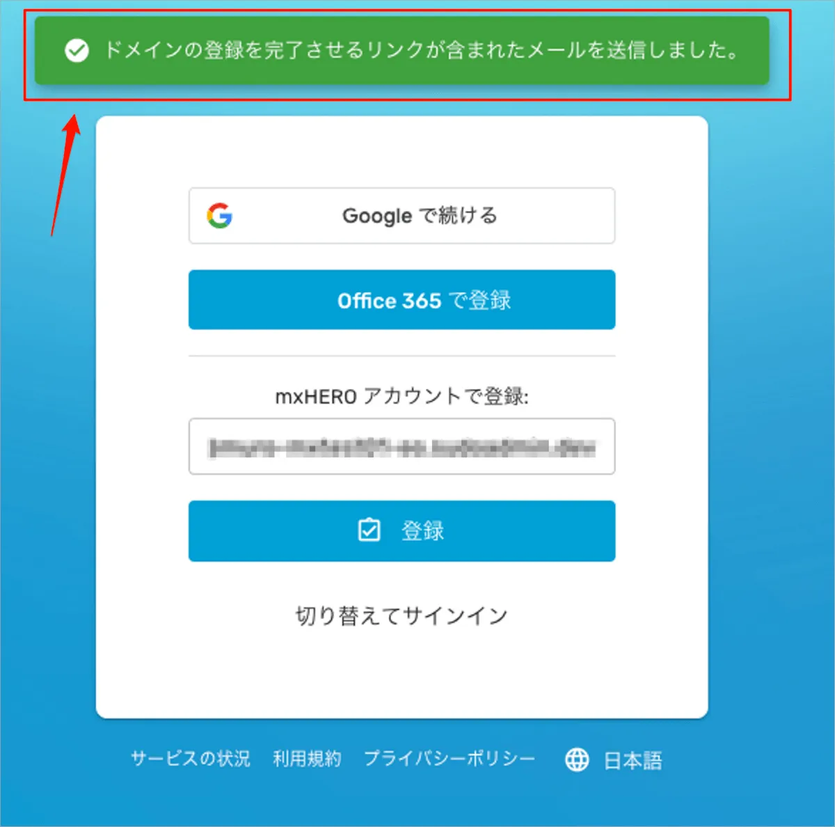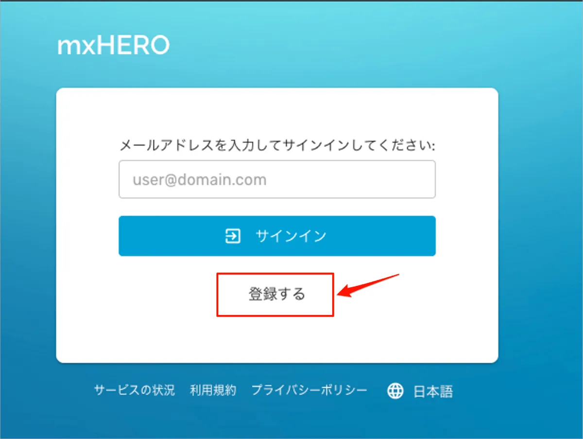 新ダッシュボード向けのmxHEROのログインURL(https://dashboard-v3.mxhero.com/login)を開き、サインイン画面で「登録する」を選択します。