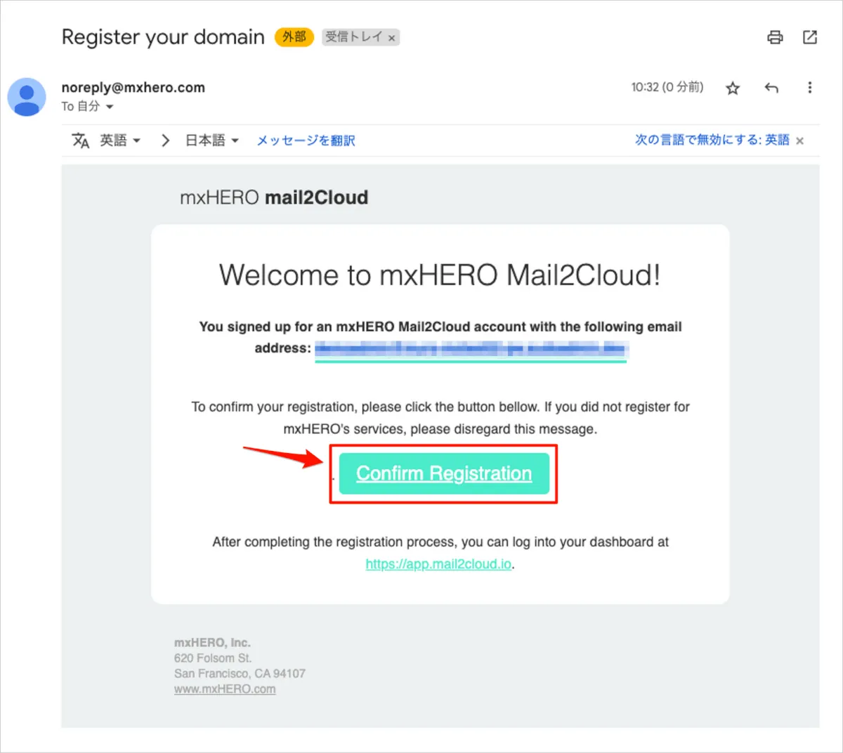 noreplay@mxheor.comより以下のメール届いていますので、メール本文内の「Confirm Registration」を選択します。