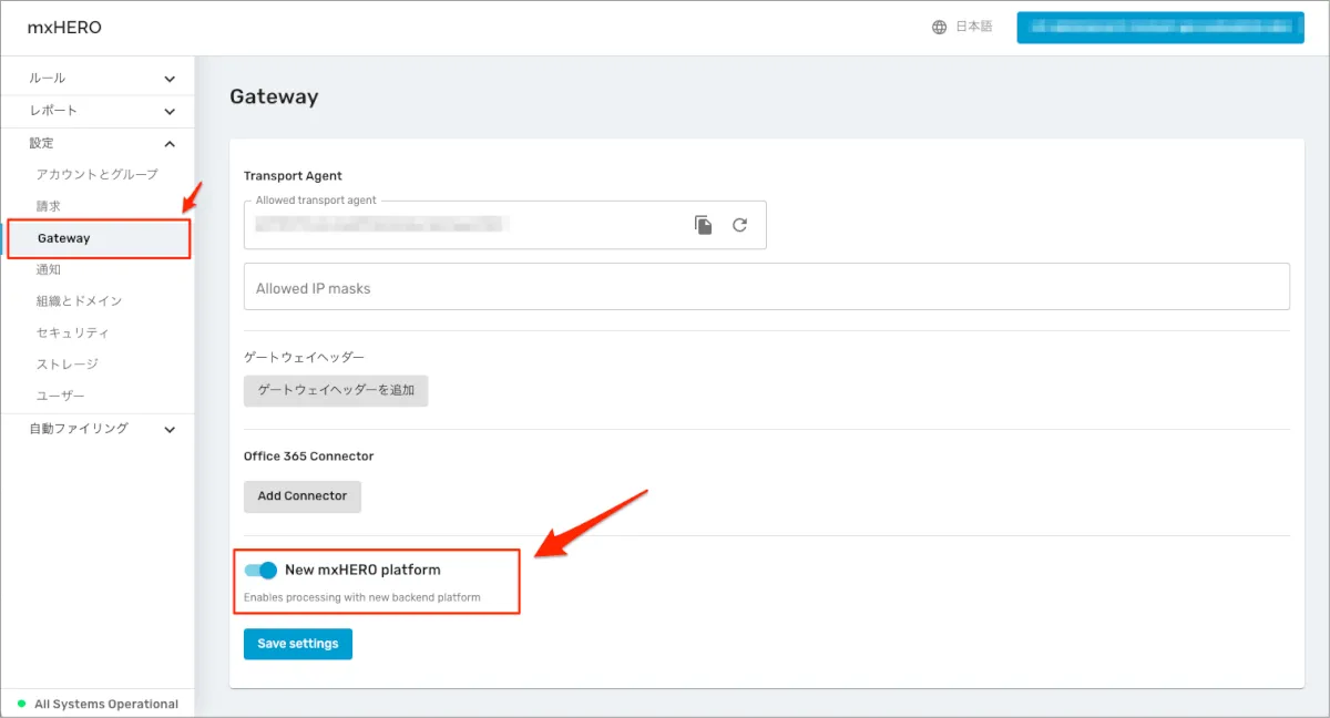 「New mxHERO Platform」のトグルを有効にして、「設定を保存」を選択し、保存します。