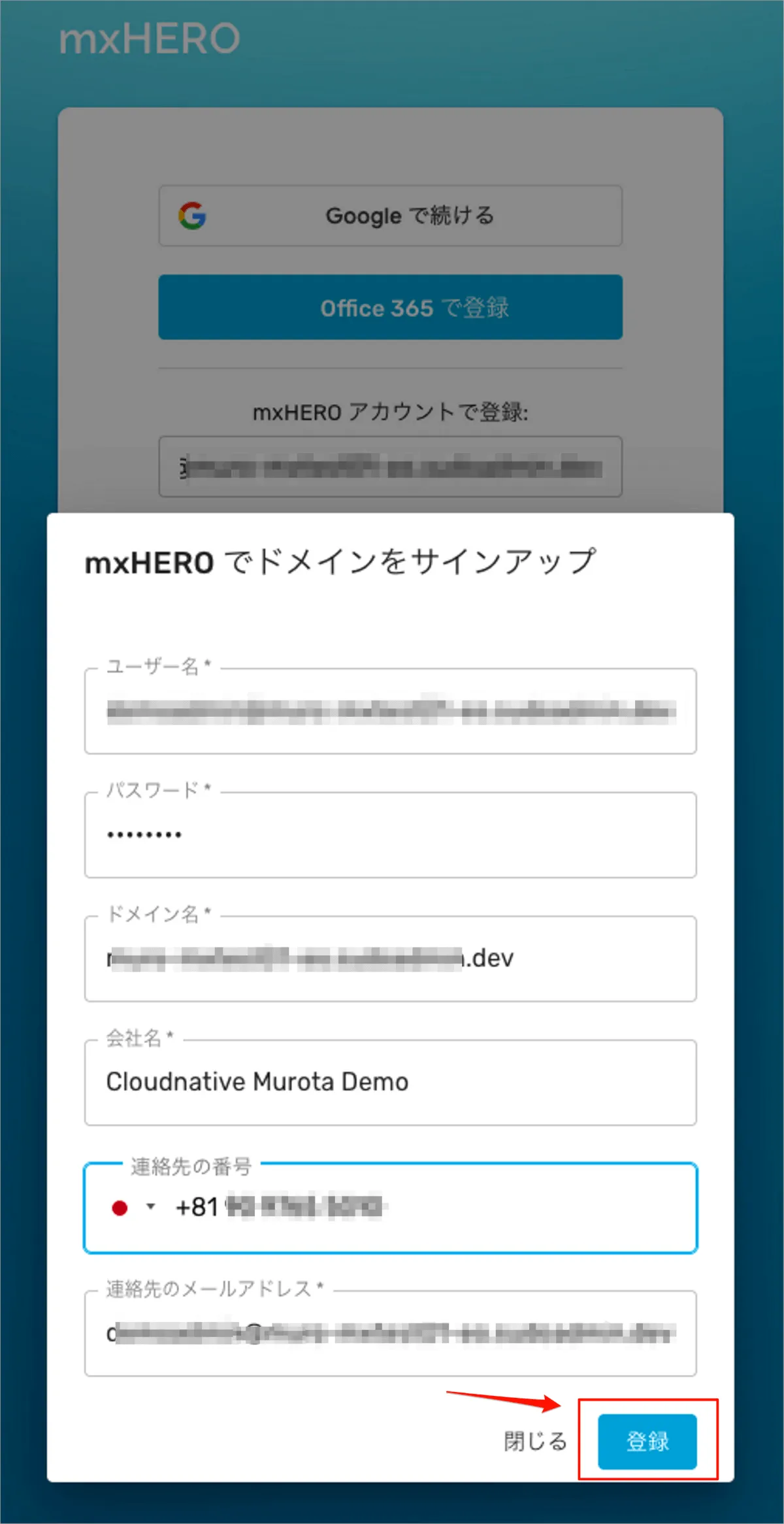 ユーザー名、パスワード、ドメイン名、会社名、電話番号、連絡先のメールアドレスを入力し、登録ボタンを選択します。