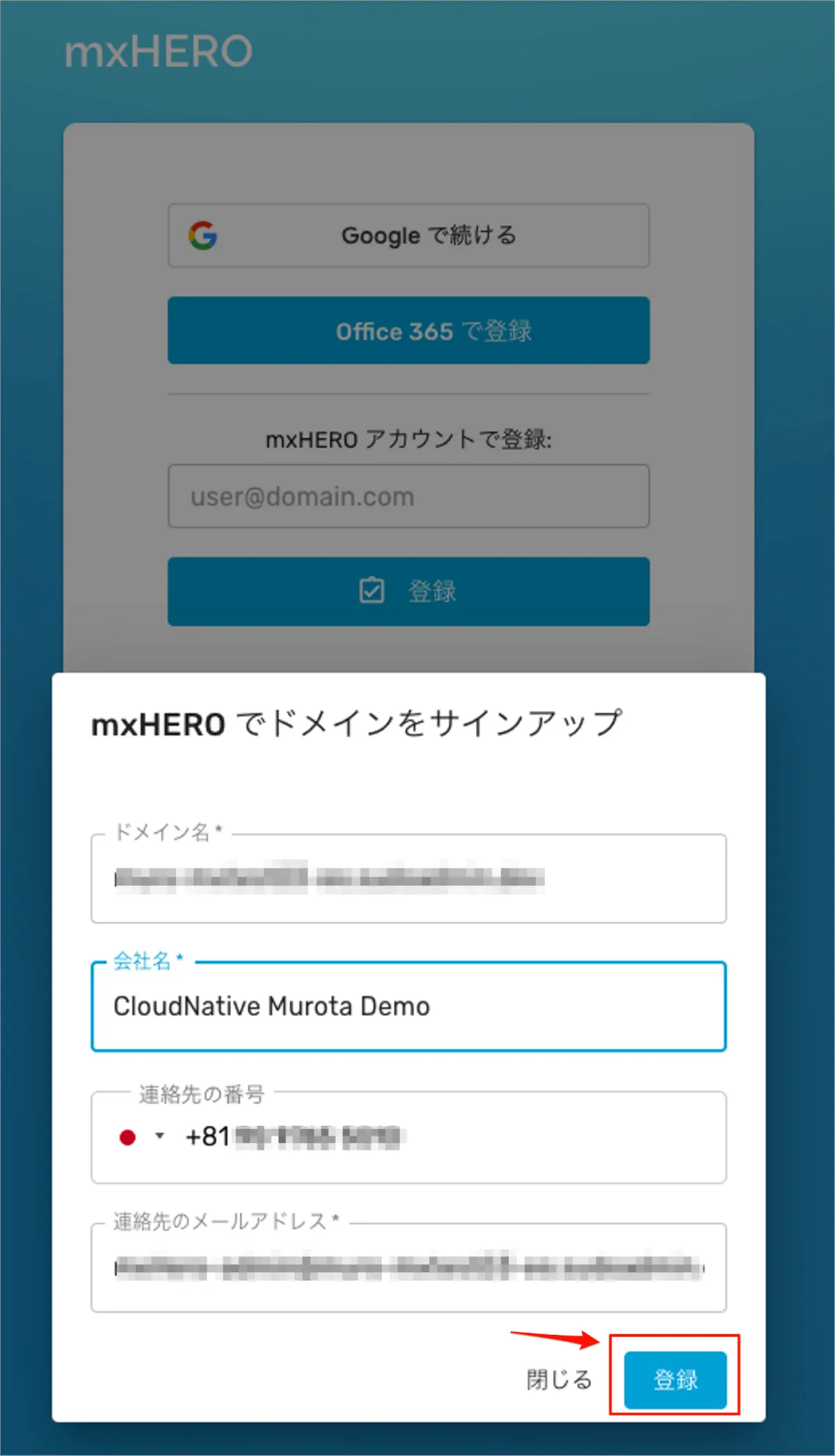 ドメイン名、会社名、電話番号、連絡先のメールアドレスを入力し、登録ボタンを選択します。