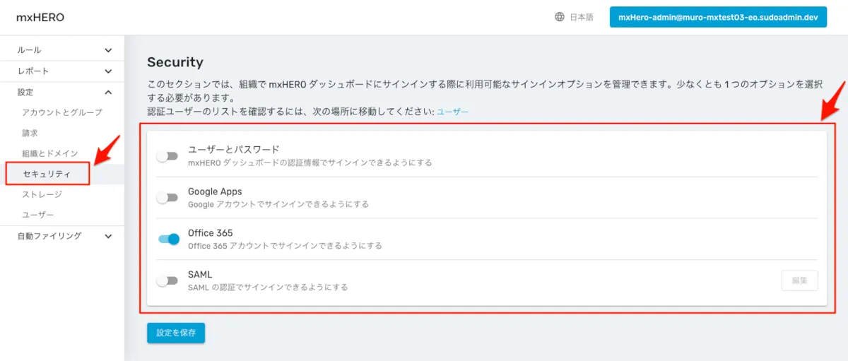 左側メニューの「設定」 > 「セキュリティ」 を選択し、設定画面を表示します。
