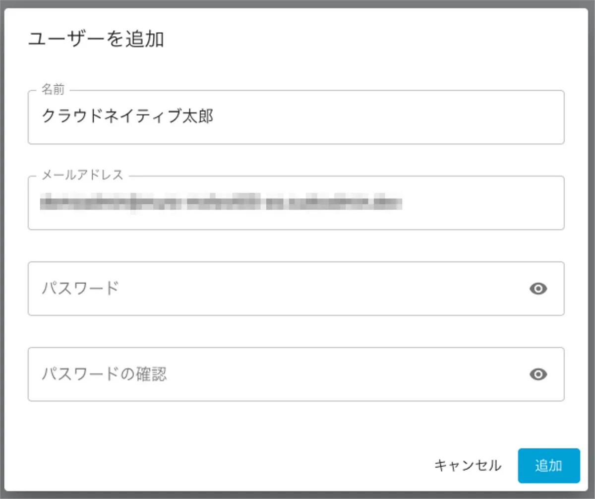 管理者アカウントを追加する場合は「ユーザーを追加」を選択し、名前とメールアドレスを設定し、保存します。