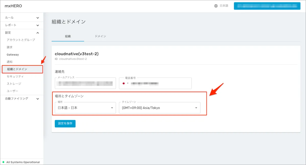 組織の言語設定とタイムゾーンを設定する
