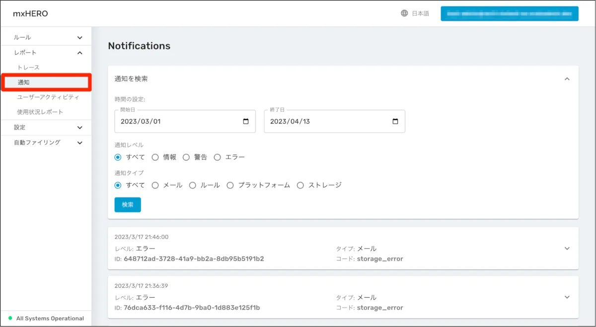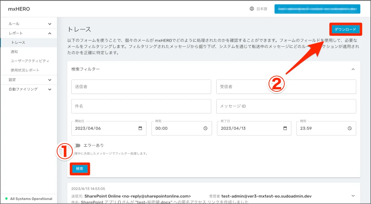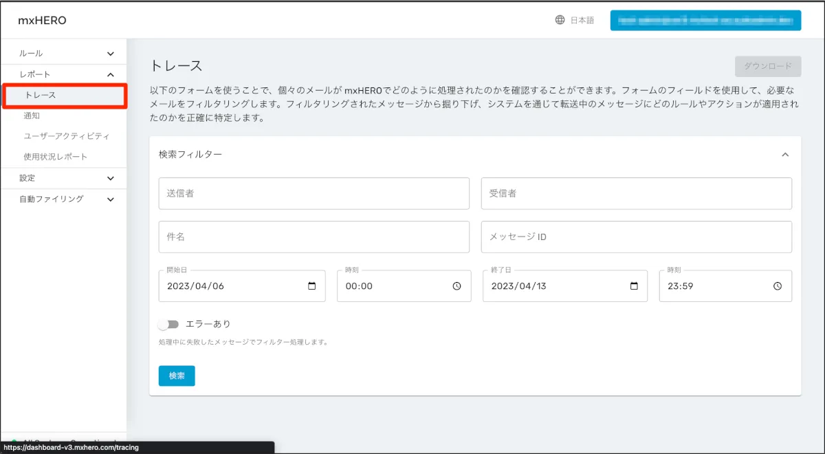 「トレース」ログはメール(Fusionルール等)が正常に処理されたか否かを確認することができるログです。後述する「通知」ログとログの内容としては同じですが、ユーザー(メール送信者・受信者)やメール件名で絞り込みたいケースで有効です。