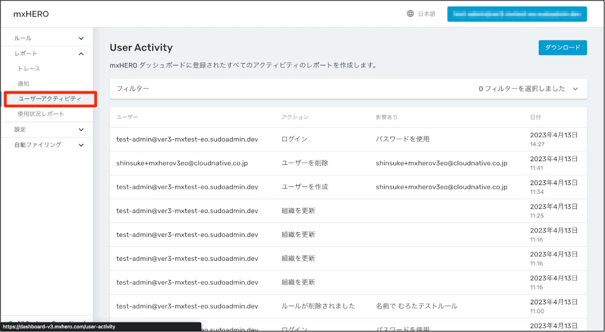 こちらはmxHERO管理ダッシュボードに対する操作に関する監査ログです。mxHERO自体のルール変更等がいつ行われたのかなどを調査する際に利用することができます。