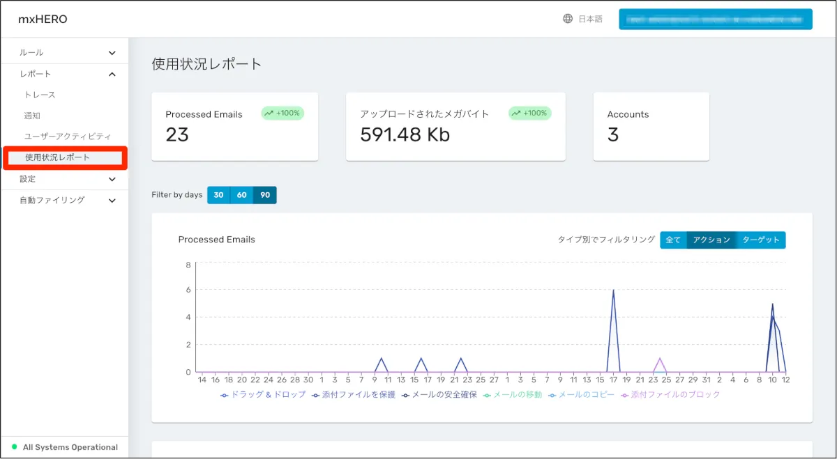 こちらは、テナント全体のmxHERO使用に関する統計情報を見ることができる画面です。もし大量の添付ファイル等がmxHEROを通じて処理されている場合、そもそも業務のあり方を見直すなどを検討しても良いかもしれません。