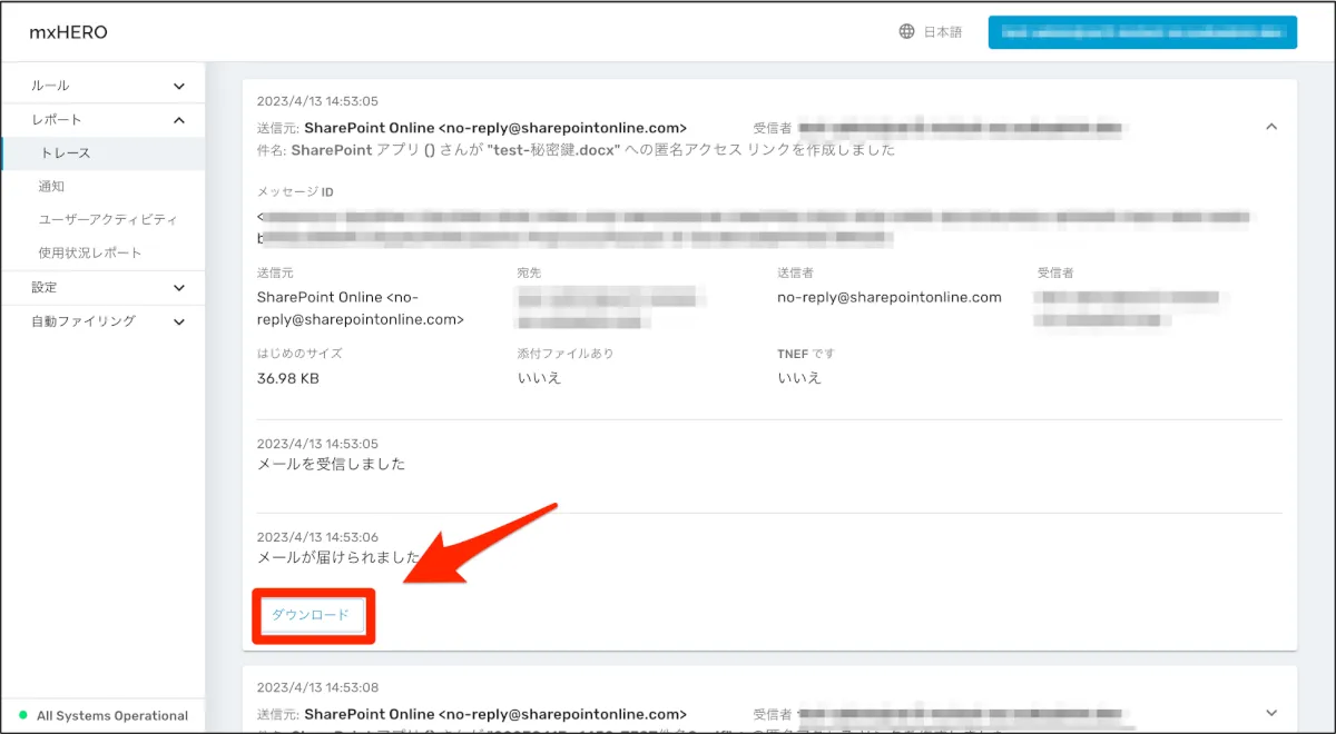 もしmxHERO利用時にエラーが発生していてサポート等で詳細な調査が必要な場合などでは、個別のレコードのログをJSON型式で取得し調査するのが有効です。検索でヒットしたレコードを選択し、[ダウンロード]をクリックするとイベント詳細.jsonというJSONファイルを取得できます。