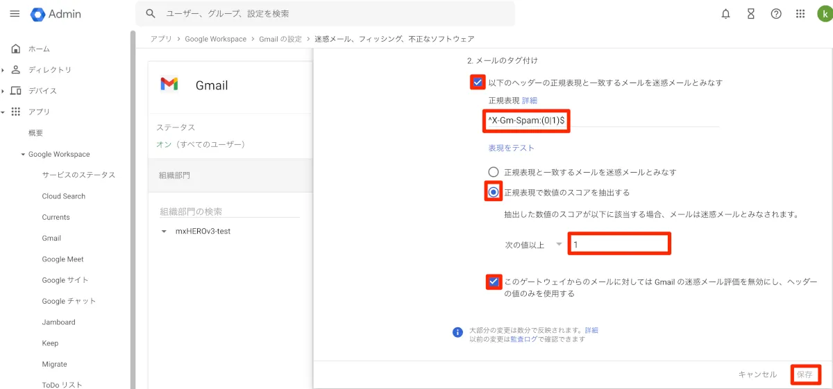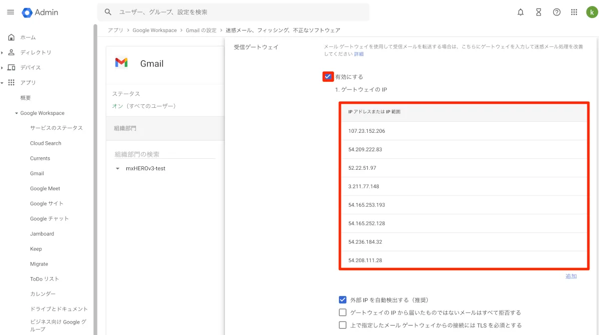 - このゲートウェイからのメールに対しては Gmail の迷惑メール評価を無効にし、ヘッダーの値のみを使用する