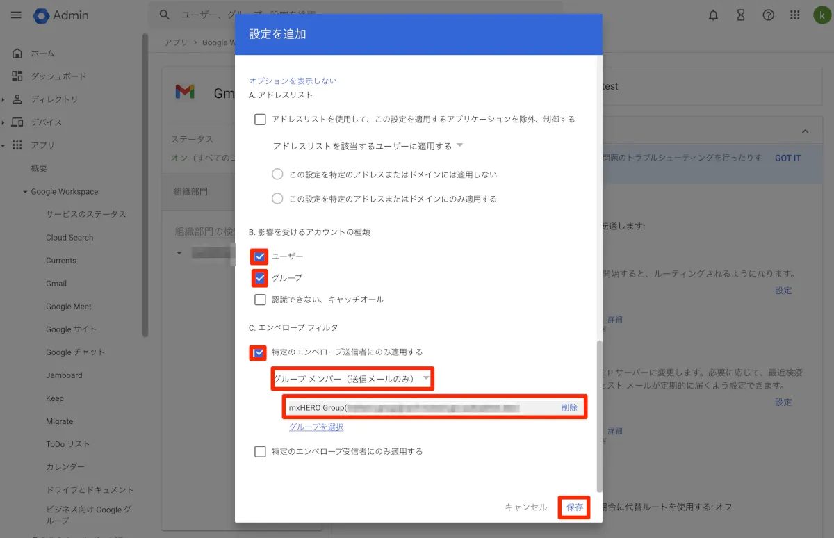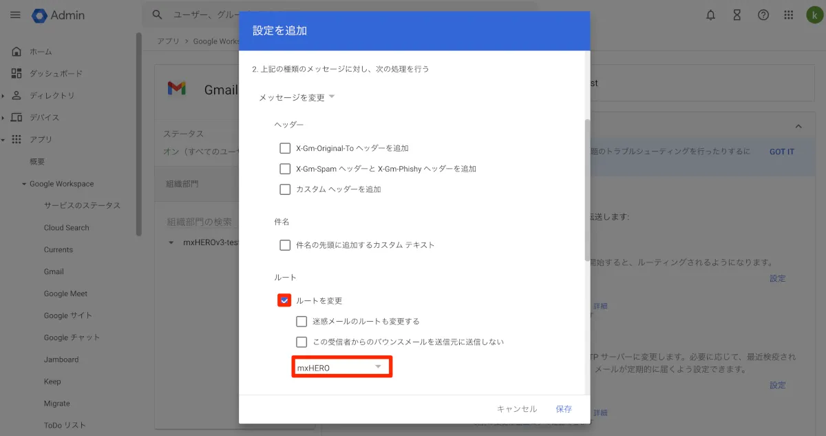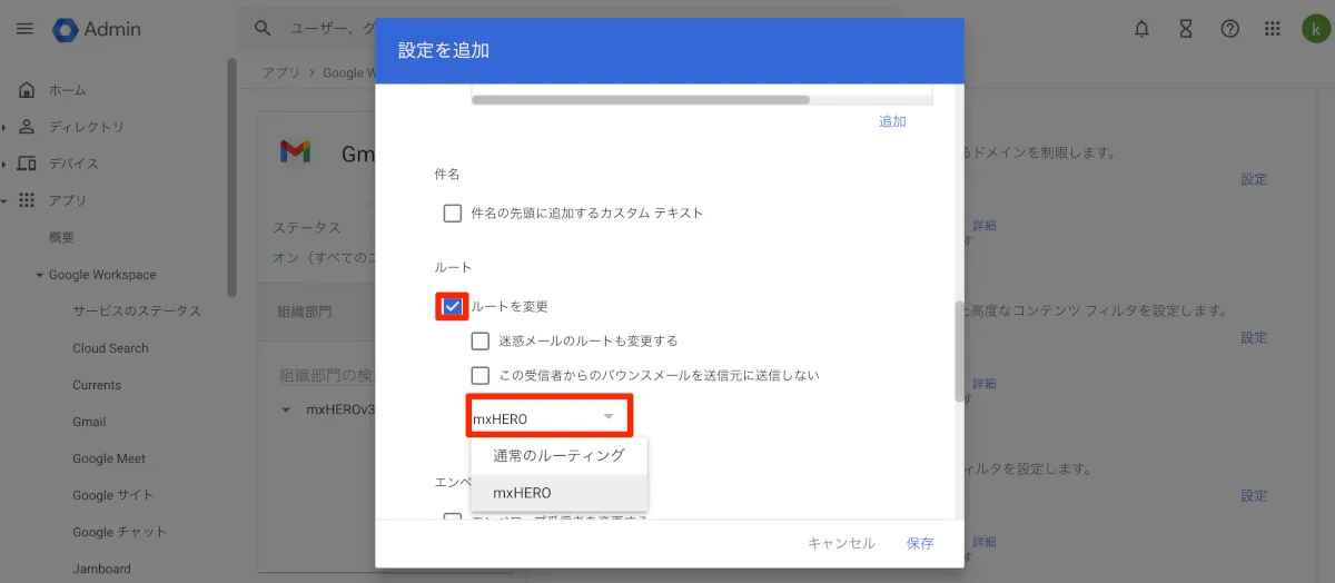 - [メールのルートを追加]にて、下記の通り設定して、[保存]をクリックします。