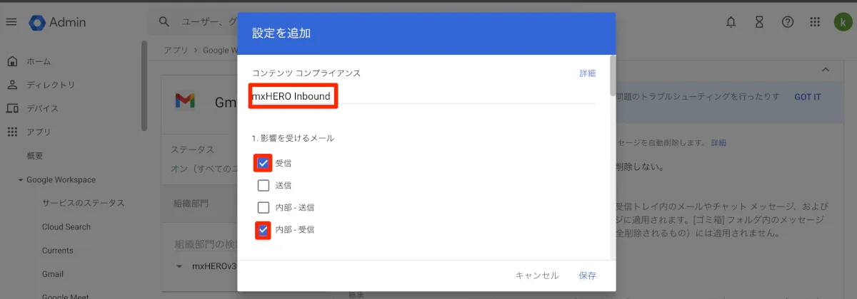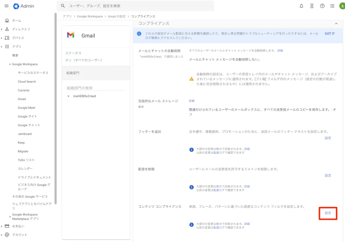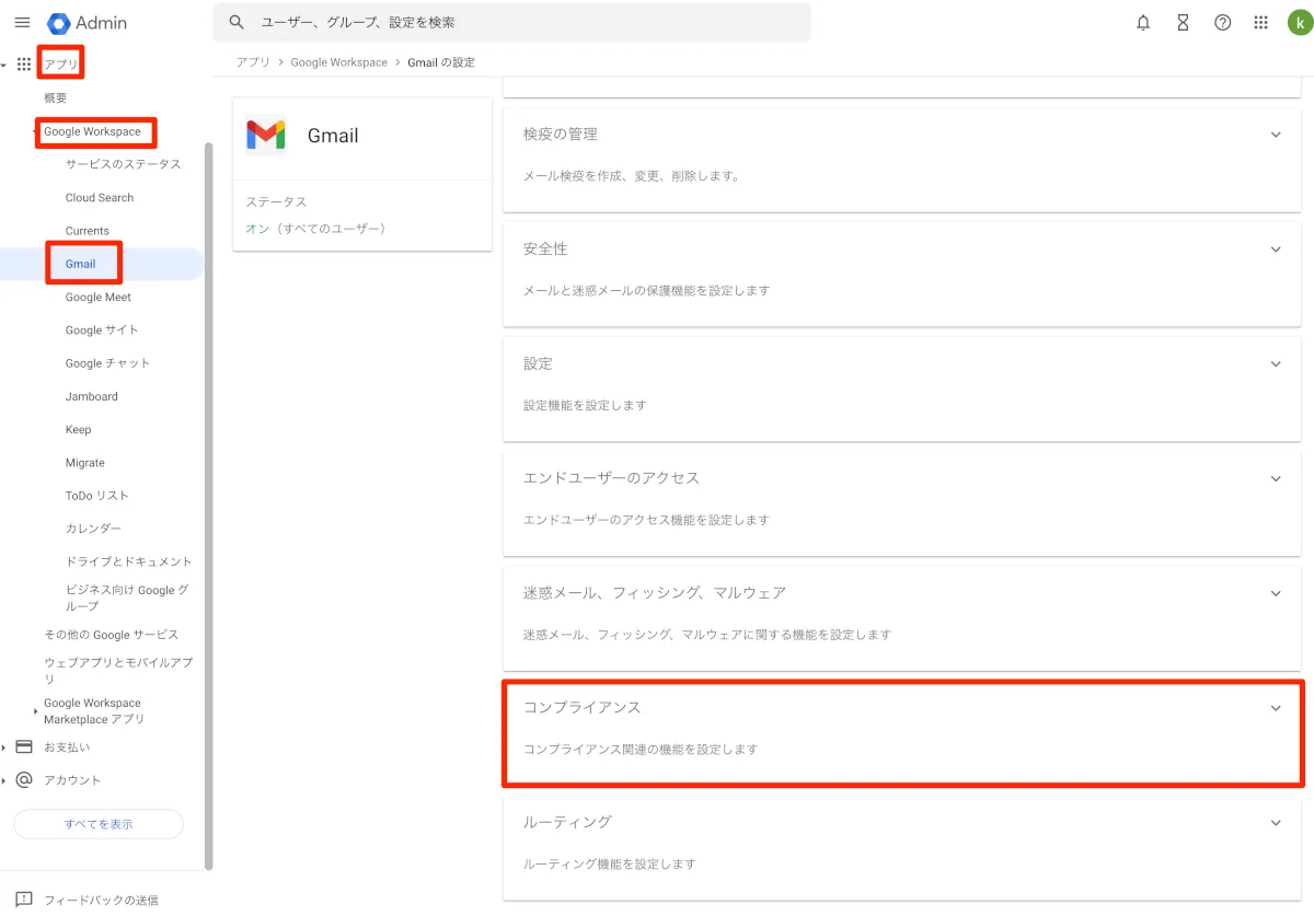 - [アプリ] > [Google Workspace] > [Gmail]の順に遷移して、[コンプライアンス]を開きます。