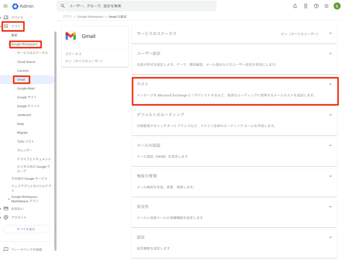 - [アプリ] > [Google Workspace] > [Gmail]の順に遷移して、[ホスト]を開きます。