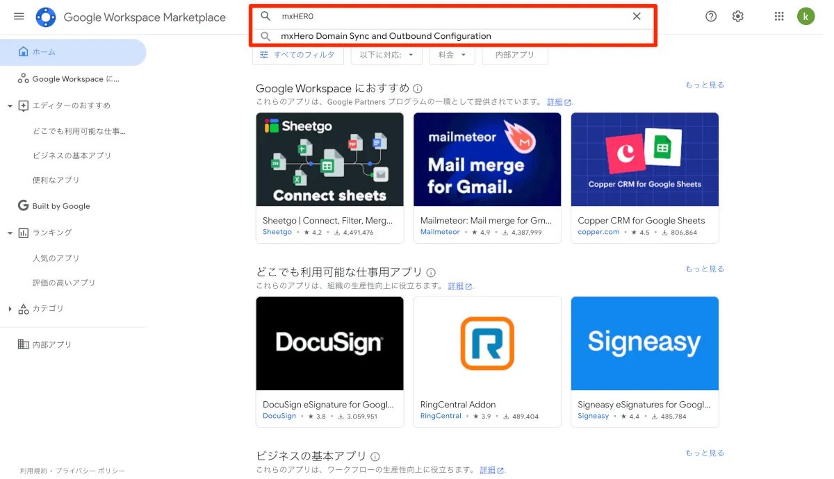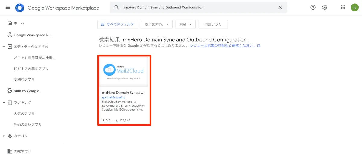 - 検索窓に[mxHERO]と入力し、表示される[mxHero Domain Sync and Outbound Configuration]をクリックします。