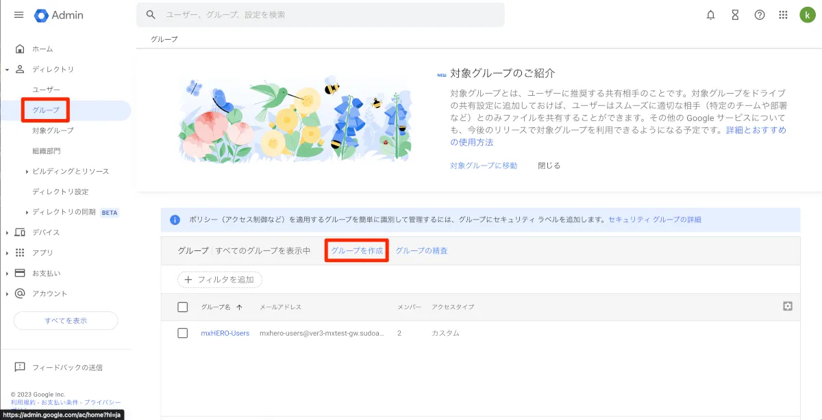 - GWSの管理コンソールへアクセスし、[グループ] > [グループを作成]の順にクリックします。