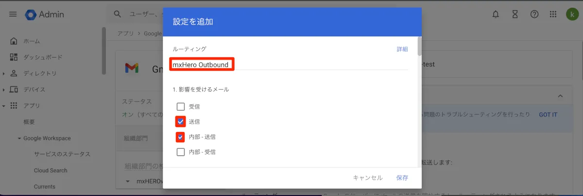 - [ルーティング]に任意の名前(例:mxHero Outbound)を設定して、[影響を受けるメール]にて、下記の通り設定します。