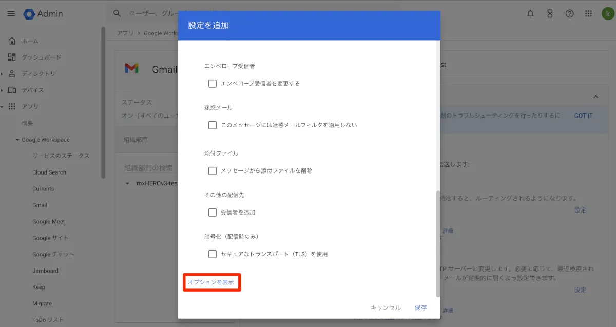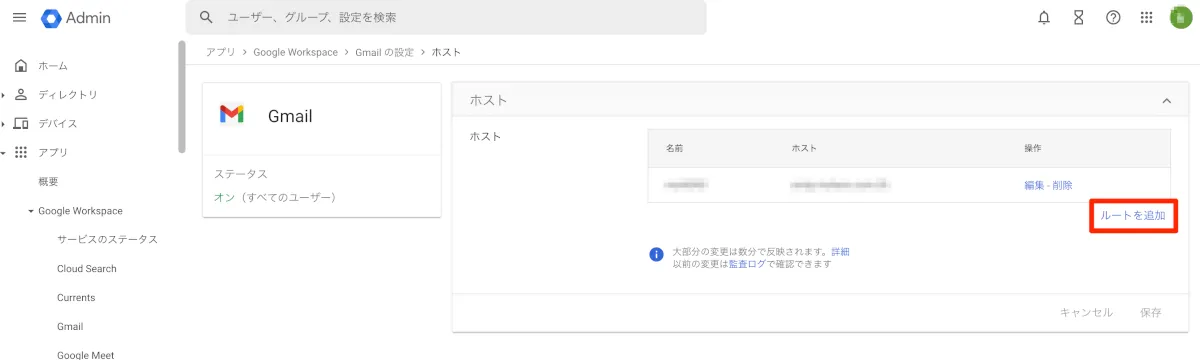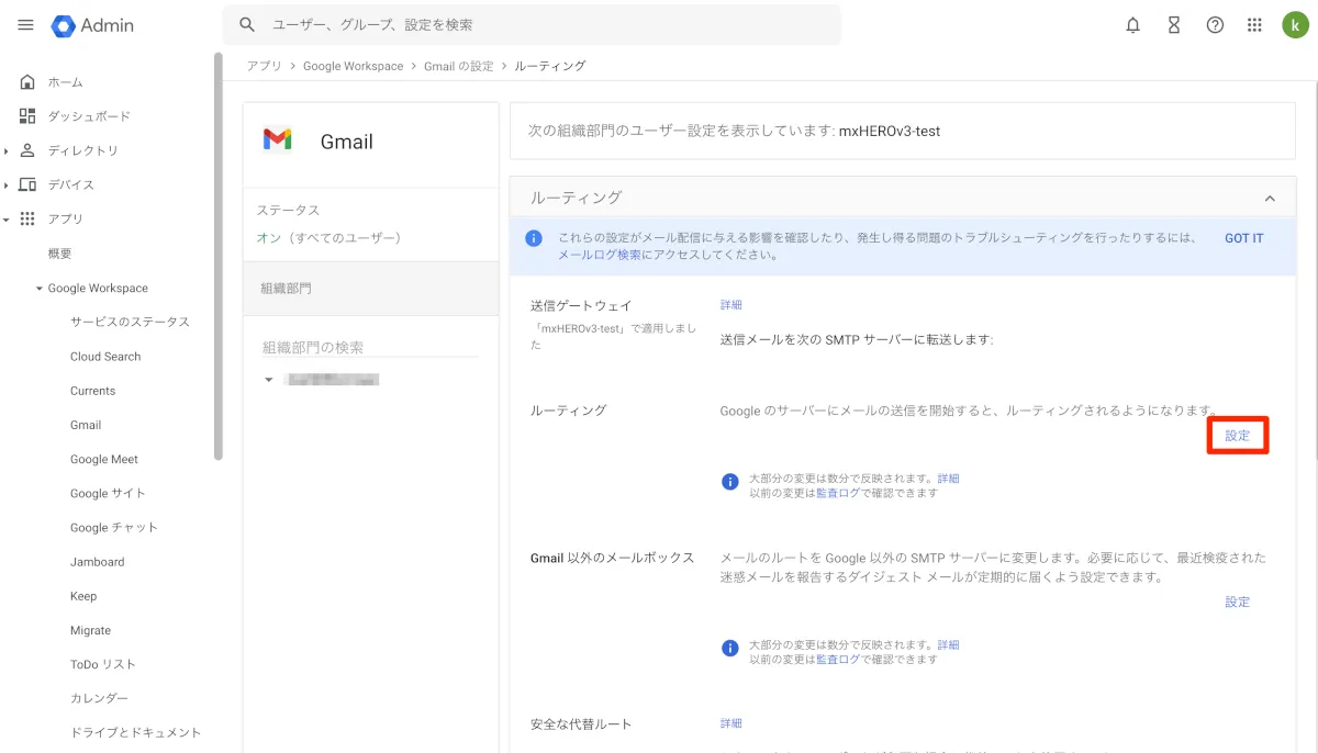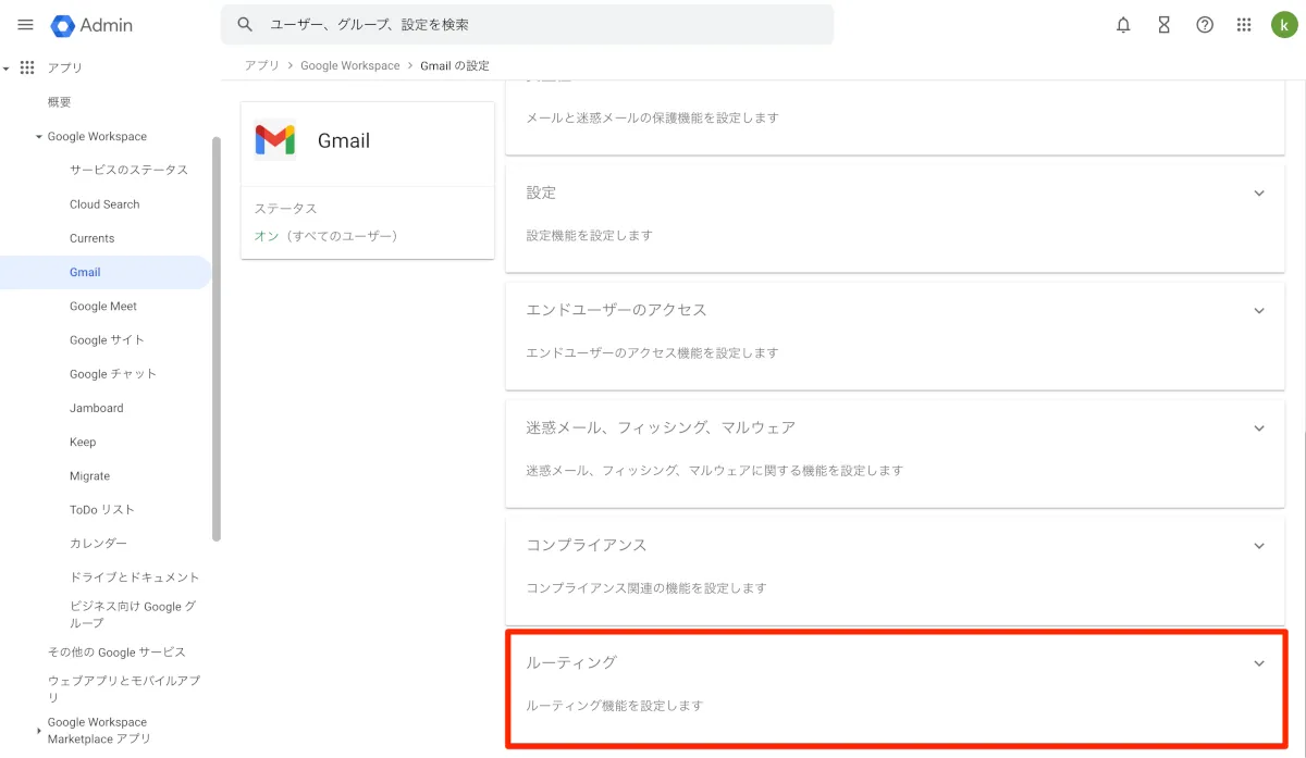 - [アプリ] > [Google Workspace] > [Gmail]の順に遷移して、[ルーティング]をクリックします。