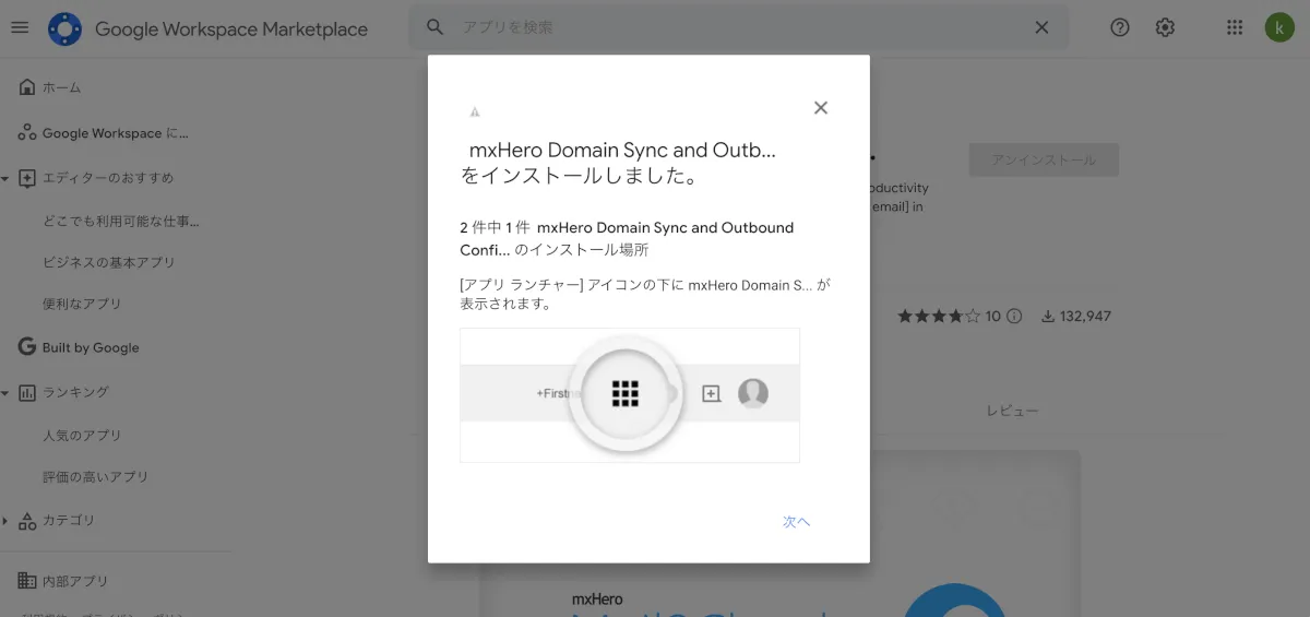 - [mxHero Domain Sync and Outbound Configurationをインストールしました]と表示されれば完了です。