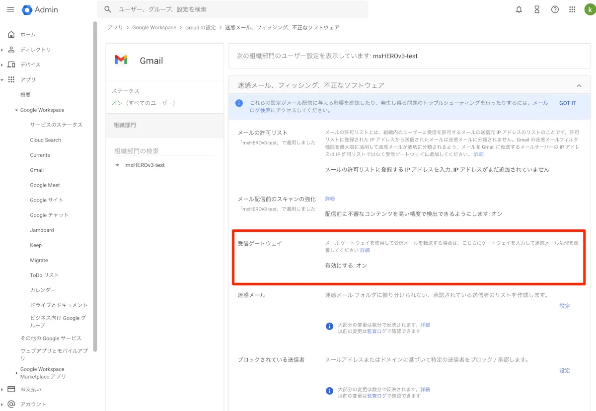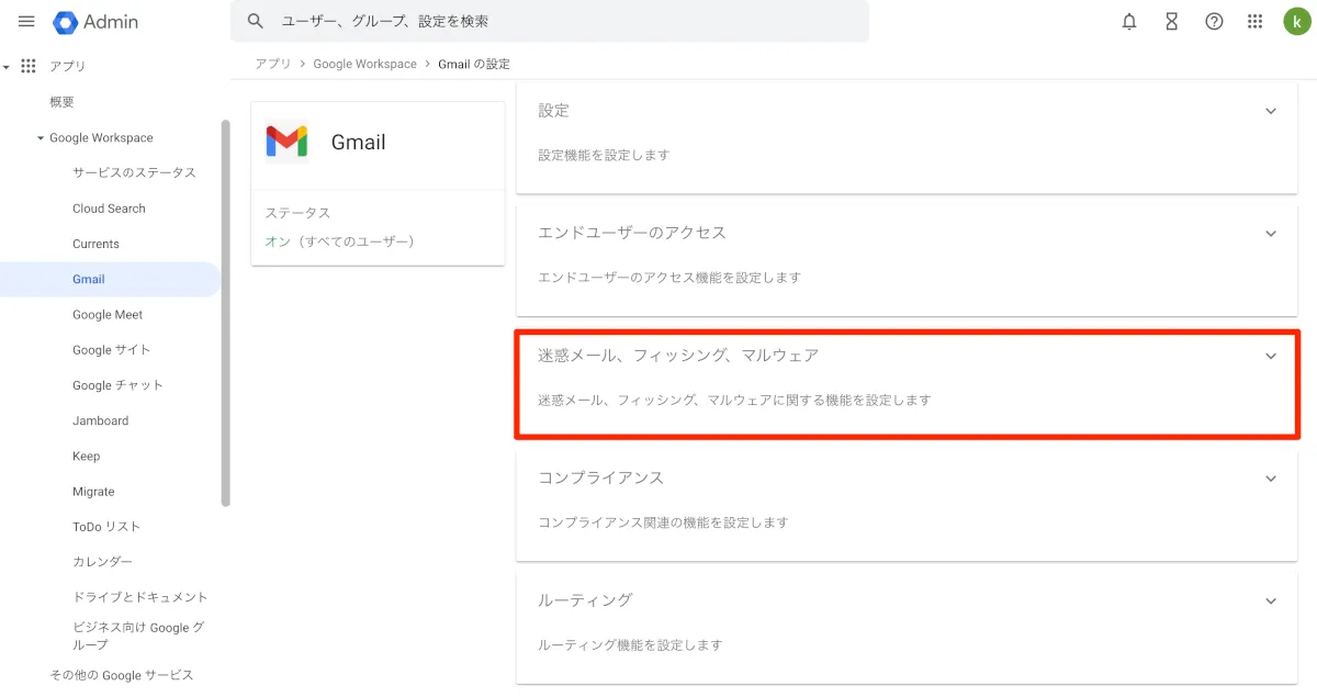 - [アプリ] > [Google Workspace] > [Gmail]の順に遷移して、[迷惑メール、フィッシング、マルウェア]を開きます。