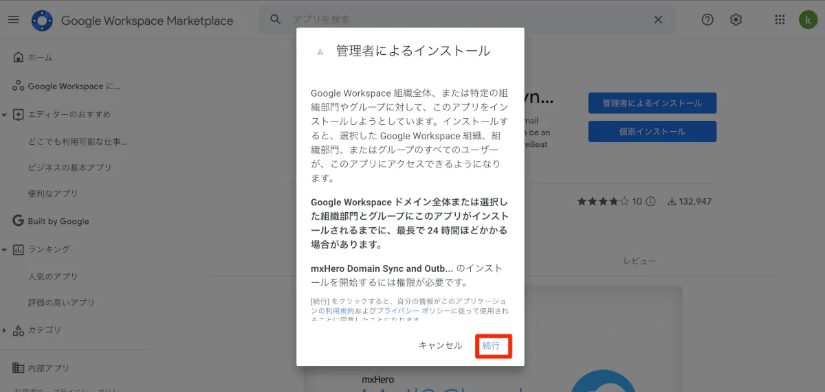 - [管理者によるインストール]にて、[続行]をクリックします。