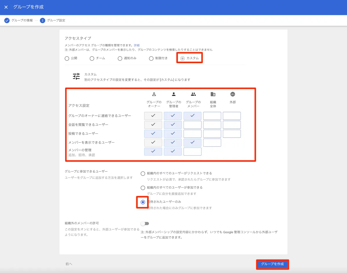- アクセスタイプを以下の画像の通りに設定して、[グループを作成]をクリックします。