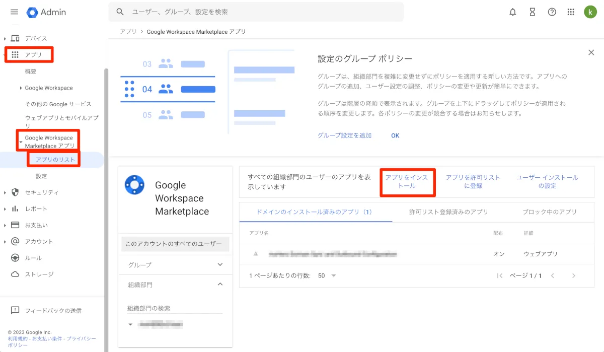 - [アプリ] > [Google Workspace Marketplaaceアプリ] > [アプリのリスト]の順に遷移して、[アプリのインストール]をクリックします。