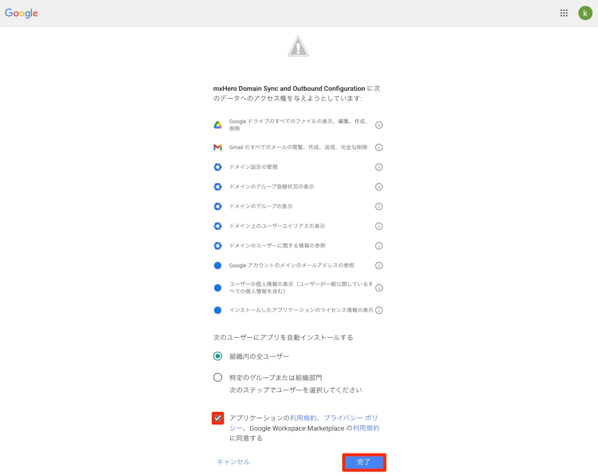 - [アプリケーションの利用規約、プライバシー ポリシー、Google Workspace Marketplace の利用規約に同意する]にチェックを入れて、[完了]をクリックします。