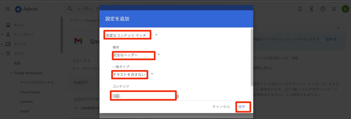 - [ヘッダーを追加]にて、以下のように設定して、[保存]をクリックします。