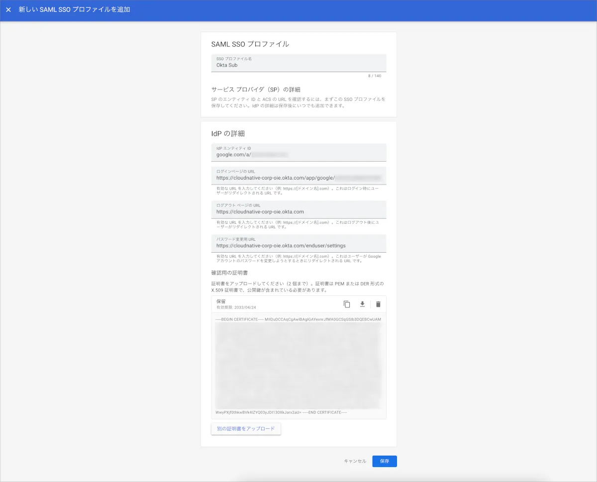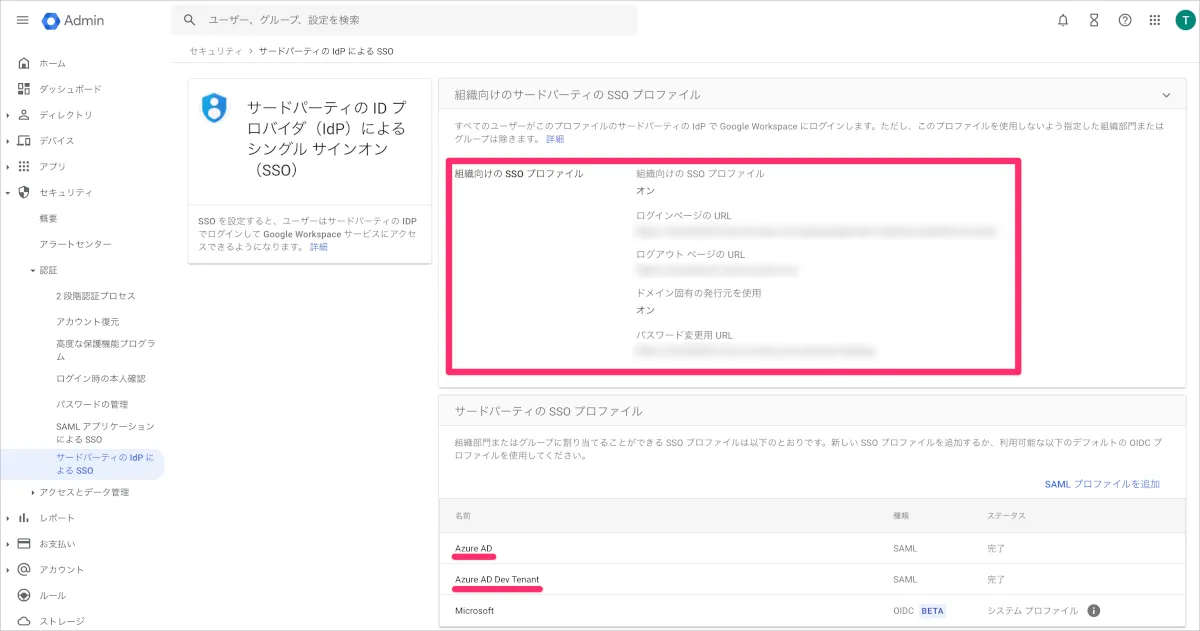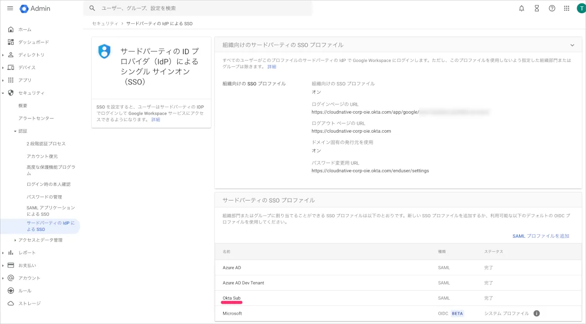 これらふたつ設定項目は組織向けのと付くが付かないかという非常に紛らわしい名称なので注意が必要です。なお、組織向けのサードパーティのSSOプロファイルはGoogle Workspace上で一つしか設定することができませんが、サードパーティのSSOプロファイルは複数設定をすることができます。