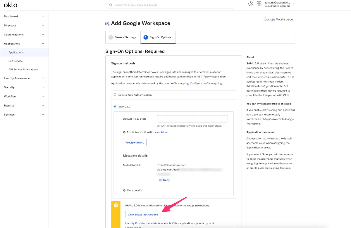 - SAML2.0を選択し、View Setup Instructionsをクリックします。