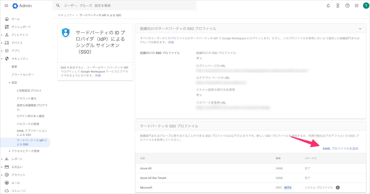 - Google Workspaceの管理画面へログインし、セキュリティ>サードパーティのIdPによるSSOからSAMLプロファイルを追加をクリックします。