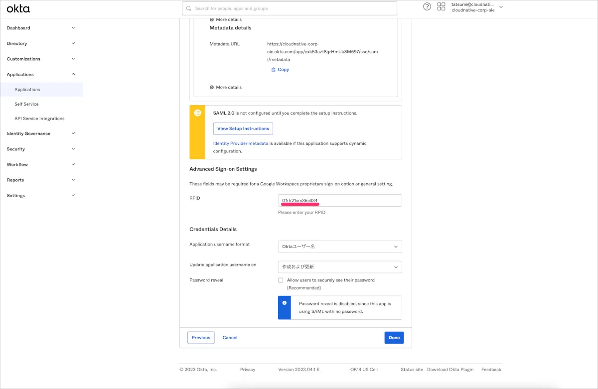 - Oktaの画面に戻りRPIDに8.でコピーした値をペースト、Doneをクリックします。