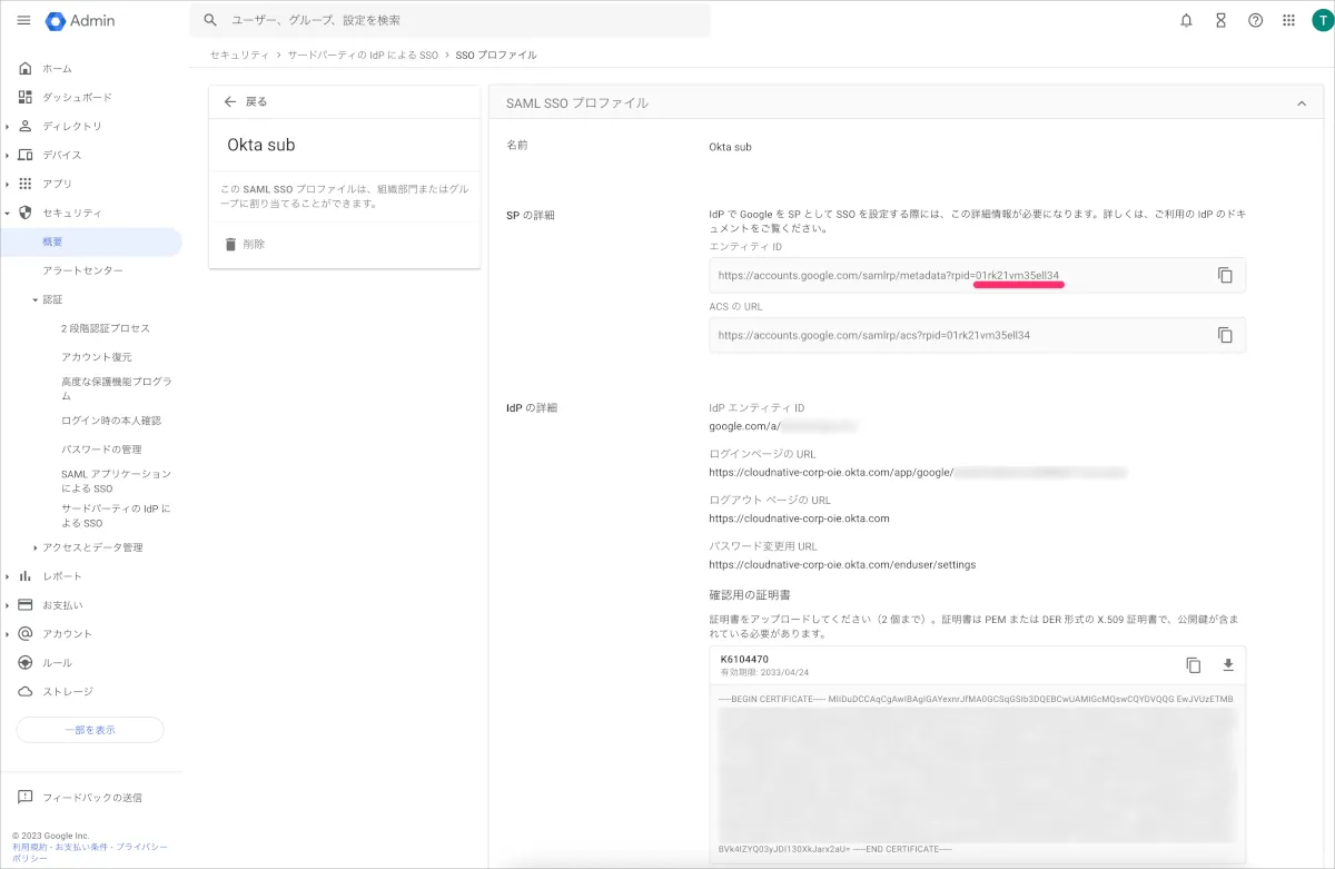 - 設定が反映され以下のような画面が表示されたらSPの詳細にあるエンティティIDの末尾にあるrpid=に続く英数字をコピーしておきます。