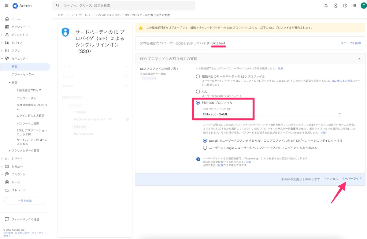 - 次にSSOプロファイルの割り当ての管理で別のSSOプロファイルにチェックを入れ、選択肢から設定を行ったSSOプロファイルを選択し、オーバーライドをクリックします。