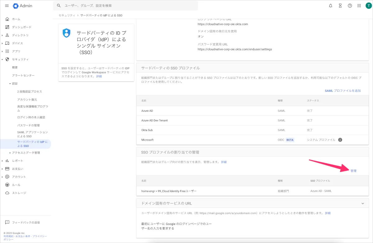 - Google Workspaceの画面に戻りセキュリティ>サードパーティのIdPによるSSO内のサードパーティのSSOプロファイルに作成した